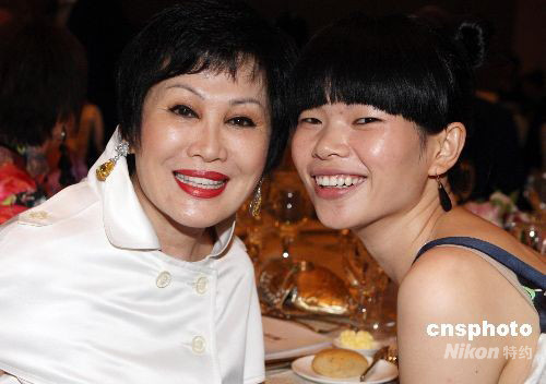 圖為美籍華人靳羽西與中國(guó)模特呂燕亮相北京突尼斯旅游文化周。 中新社發(fā) 錢興強(qiáng) 攝
