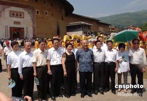 八月十四日下午,中國(guó)國(guó)民黨主席吳伯雄一行來(lái)到“土樓之鄉(xiāng)”福建永定縣的高北土樓群參觀游覽,在“土樓王”承啟樓前合影留念。中新社發(fā) 鄭祚聲 攝