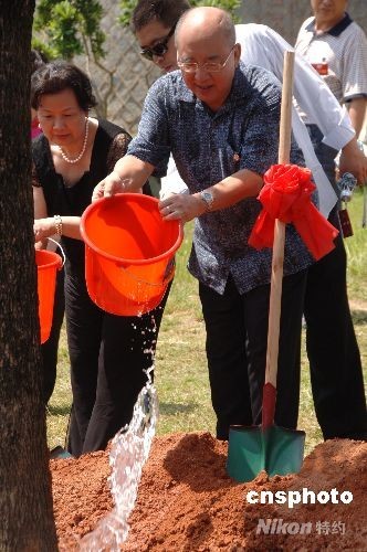 八月十四日下午,中國(guó)國(guó)民黨主席吳伯雄一行在福建永定縣高北土樓群的“土樓王”承啟樓前,植樹紀(jì)念此次祖地行。圖為吳伯雄夫婦為新種下的香樟樹澆水。中新社發(fā) 鄭祚聲 攝