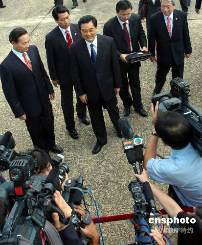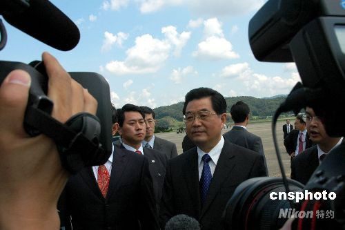 中國(guó)國(guó)家主席胡錦濤八月二十五日中午抵達(dá)韓國(guó)首都首爾,胡錦濤在機(jī)場(chǎng)對(duì)記者發(fā)表講話。