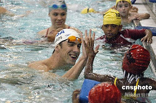 8月28日,在北京奧運(yùn)會上手握八金的美國泳將菲爾普斯出現(xiàn)在紐約青年會游泳館,希望通過親身傳授“泳技”,讓更多孩子開始自己的奧運(yùn)夢想。中新社發(fā) 魏晞 攝