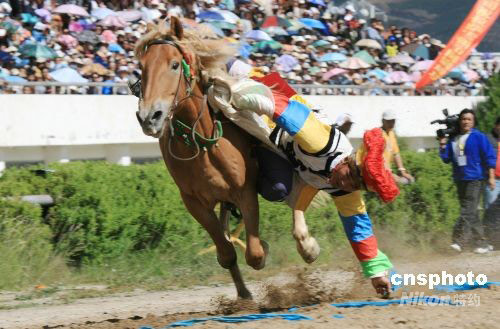 9月1日,2008中國(guó)拉薩雪頓節(jié)馬術(shù)表演和賽牦牛在拉薩賽馬場(chǎng)舉行。馬術(shù)表演和賽牦牛是藏民族傳統(tǒng)體育競(jìng)技比賽,當(dāng)日來(lái)自拉薩市縣區(qū)的幾支隊(duì)伍進(jìn)行了精彩的騎馬射擊、馬術(shù)表演、拾哈達(dá)及賽牦;顒(dòng),吸引了成千上萬(wàn)的游客和市民前來(lái)觀看。中新社發(fā) 周波 攝