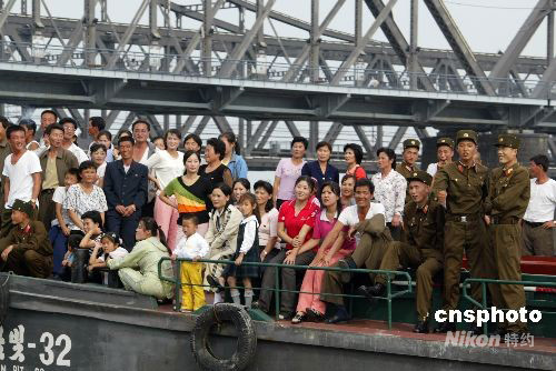 9月9日正值朝鮮國(guó)慶,朝鮮新義洲民眾有組織地乘船游覽鴨綠江。身著節(jié)日服裝的朝鮮民眾站在船上眺望一江之隔的中國(guó)丹東,并向中國(guó)民眾招手致意。中新社發(fā) 陳浩浩 攝