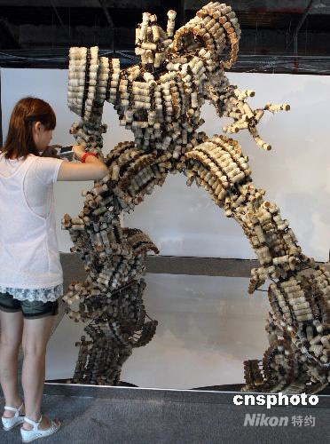9月9日,上海雙年展國(guó)際學(xué)生展在創(chuàng)智天地拉開(kāi)帷幕,國(guó)際學(xué)生展歷來(lái)是上海雙年展的主要藝術(shù)活動(dòng)之一,本次展覽吸引了中外40余所一流設(shè)計(jì)院校前來(lái)參展。圖為一個(gè)由紡織廠(chǎng)廢棄物件組成的“變形金剛”吸引參觀(guān)者。中新社發(fā) 湯彥俊 攝