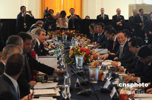 當(dāng)?shù)貢r(shí)間九月十六日,第十九屆中美商貿(mào)聯(lián)委會(huì)在美國(guó)加州約巴琳達(dá)市的“尼克松圖書(shū)館與誕生地基金會(huì)”舉行。 中國(guó)國(guó)務(wù)院副總理王岐山和美國(guó)商務(wù)部長(zhǎng)古鐵雷斯(左一)、貿(mào)易代表施瓦布共同主持此次會(huì)議,兩國(guó)政府相關(guān)部門(mén)官員參加會(huì)議。