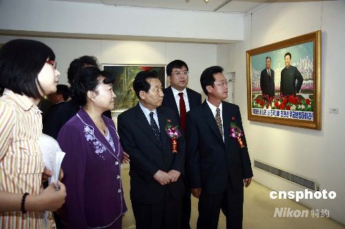 由中華人民共和國(guó)文化部、朝鮮民主主義人民共和國(guó)文化省主辦,中國(guó)對(duì)外藝術(shù)展覽中心承辦的“為紀(jì)念朝鮮民主主義人民共和國(guó)成立六十周年-朝鮮美術(shù)展”18日在北京中外博藝畫(huà)廊開(kāi)幕。此次展覽展示了朝鮮著名功勛藝術(shù)家、人民藝術(shù)家、以及青年畫(huà)家創(chuàng)作的朝鮮畫(huà)、油畫(huà)、版畫(huà)、刺繡等美術(shù)作品五十九幅。圖為出席開(kāi)幕式的中華人民共和國(guó)文化部文化部副部長(zhǎng)趙少華(右四)、朝鮮民主主義人民共和國(guó)駐華大使崔鎮(zhèn)洙(右三)等在觀展。中新社發(fā) 邢利宇 攝