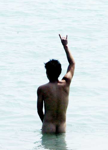 臺(tái)灣電影“海角七號(hào)”票房十八日將破億元(新臺(tái)幣),男主角范逸臣在拍片場(chǎng)景之一的墾丁海邊,履行海里裸泳慶功諾言。