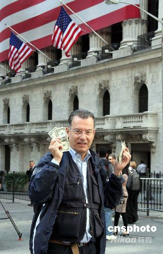 9月19日,來自意大利的游客里奧(Leone)在紐約證券交易所前,手拿美鈔留影。里奧說,不管華爾街正在經(jīng)歷多糟糕的事情,這里仍然是全球資本最集中的地方,是投資人的朝圣地。中新社發(fā) 魏晞 攝