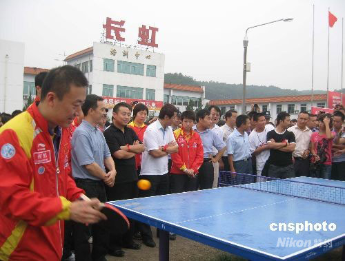 9月20日,中國(guó)體育總局乒羽中心主任劉鳳巖、男乒主教練劉國(guó)梁、女乒主教練施之皓、隊(duì)員張怡寧、馬琳、王皓、王勵(lì)勤等一行15人帶著奧運(yùn)金牌、榮譽(yù)、喜悅和祝福,前往四川綿陽(yáng)長(zhǎng)虹培訓(xùn)中心看望慰問(wèn)在汶川大地震中遭受重創(chuàng)的北川中學(xué)學(xué)生。圖為馬琳等隊(duì)員與學(xué)生們切磋球技。中新社發(fā) 肖青 攝