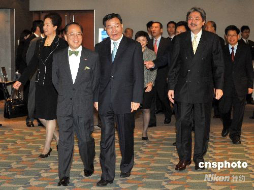 九月二十二日,香港特區(qū)政府、國(guó)家商務(wù)部和廣東省政府在香港會(huì)展中心合辦宣講會(huì),向香港工商界和相關(guān)服務(wù)機(jī)構(gòu)介紹CEPA補(bǔ)充協(xié)議五及廣東省先行先試服務(wù)業(yè)開放措施的具體內(nèi)容。圖為香港特區(qū)行政長(zhǎng)官曾蔭權(quán)與國(guó)家商務(wù)部副部長(zhǎng)姜增偉等出席宣講會(huì)。中新社發(fā) 鄧慶樂 攝