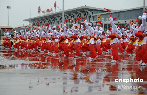 9月22日上午,以中共中央政治局常委、中央紀(jì)委書(shū)記賀國(guó)強(qiáng)為團(tuán)長(zhǎng)的中央代表團(tuán),乘專機(jī)抵達(dá)銀川河?xùn)|機(jī)場(chǎng),受到寧夏回族自治區(qū)官員和民眾的熱烈歡迎。圖為寧夏回族青年舞動(dòng)腰鼓歡迎中央代表團(tuán)抵達(dá)銀川。中新社發(fā) 廖攀 攝