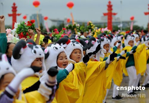 9月22日,中央人民政府向?qū)幭幕刈遄灾螀^(qū)贈(zèng)送民族團(tuán)結(jié)寶鼎儀式在銀川舉行,當(dāng)?shù)厣倌陜和缱鳌把驅(qū)殞殹睔g迎中央代表團(tuán)。中新社發(fā) 廖攀 攝