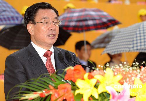 中央代表團團長、中共中央政治局常委、中央紀委書記賀國強在大會上作重要講話。中新社發(fā) 廖攀 攝