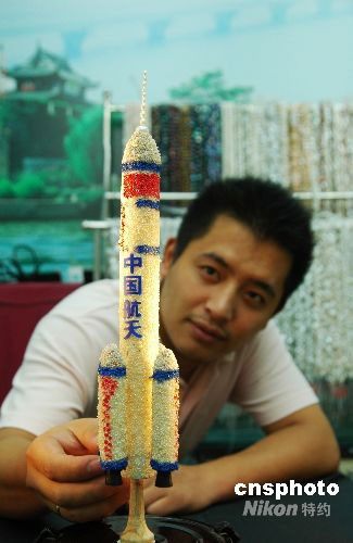 2008年9月25日,一件由天然淡水珍珠串成的神舟七號(hào)立體“飛船”亮相蘇州市相城區(qū)渭塘中國(guó)珍珠寶石城。珍珠“神七”立體“飛船”耗費(fèi)了500余萬(wàn)顆色澤均勻的優(yōu)質(zhì)珍珠,由曾獲“珍珠工藝超人”稱號(hào)的蘇印珠寶行計(jì)曉明師傅耗時(shí)3個(gè)月制作而成。中新社發(fā) 朱子寒 攝