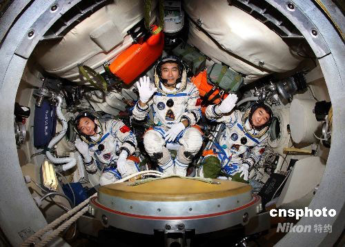 神舟七號(hào)航天員翟志剛(中)、劉伯明(右)、景海鵬(左)在返回艙訓(xùn)練。