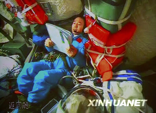 9月26日,航天員景海鵬在神舟七號載人飛船返回艙內(nèi)與北京飛控中心通話(攝于北京航天飛行控制中心大屏幕)。25日發(fā)射成功的神舟七號載人飛船運(yùn)行正常。新華社記者 查春明 攝