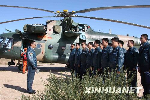 9月26日,在內(nèi)蒙古四子王旗神舟七號飛船主著陸場,空中搜救分隊的直升機轉(zhuǎn)場至回收任務待命區(qū)。這是陸航某團長、特級飛行員蔡有固在進行戰(zhàn)前動員。 新華社記者 王建民 攝