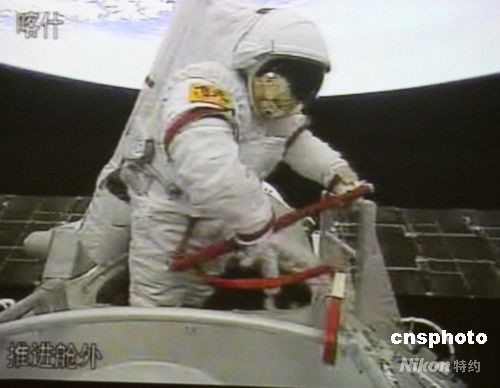 北京時(shí)間九月二十七日下午四點(diǎn)五十九分,神舟七號(hào)航天員翟志剛成功出艙,實(shí)現(xiàn)中國(guó)歷史上第一次太空行走。圖為翟志剛完成太空行走后準(zhǔn)備從太空中返回軌道艙(攝于北京航天飛控中心大屏幕)。中新社發(fā) 齊彬 攝