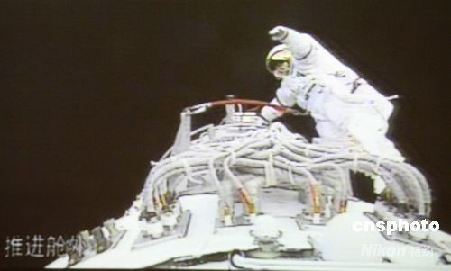北京時(shí)間九月二十七日下午四點(diǎn)五十九分,神舟七號(hào)航天員翟志剛成功出艙,實(shí)現(xiàn)中國(guó)歷史上第一次太空行走。圖為攝于北京航天飛控中心大屏幕的在太空中的翟志剛。中新社發(fā) 齊彬 攝