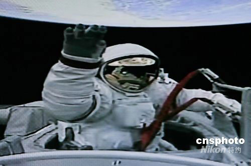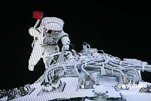 北京時間九月二十七日下午四點(diǎn)五十九分,神舟七號航天員翟志剛成功返回軌道艙,實現(xiàn)中國歷史上第一次太空行走。(攝于電視屏幕)中新社發(fā) 武仲林 攝