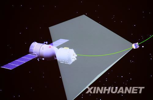 9月27日,在完成航天員出艙任務(wù)后,神舟七號飛船在太空釋放一顆伴飛小衛(wèi)星(攝于北京航天飛行控制中心大屏幕)。新華社記者 查春明 攝