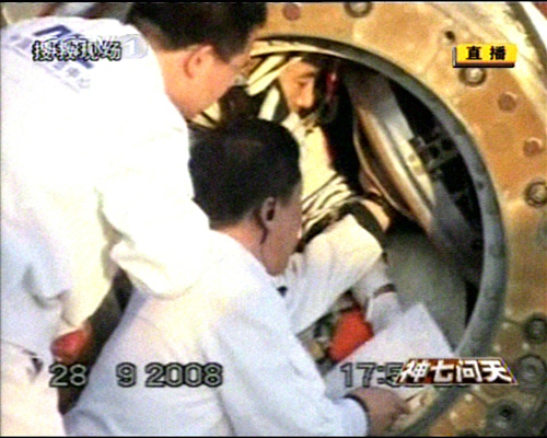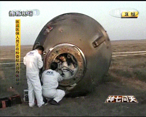 神舟七號(hào)飛船返回艙順利著陸,返回艙外觀檢查正常,搜救隊(duì)員按程序打開返回艙艙門,醫(yī)監(jiān)醫(yī)保人員檢查航天員身體狀況。經(jīng)醫(yī)監(jiān)醫(yī)保人員檢查,三名航天員身體狀況良好。三人面帶笑容。