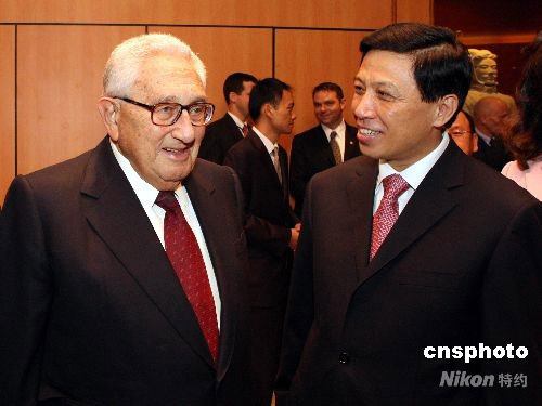 中國常駐聯(lián)合國代表團(tuán)29日晚舉辦中國國慶59周年招待會,美國前國務(wù)卿基辛格出席,中國新任常駐聯(lián)合國代表張業(yè)遂與基辛格親切交談。中新社發(fā) 李靜 攝