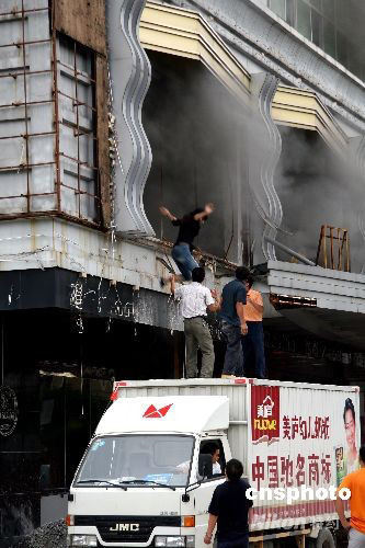 10月5日下午,廣西玉林市瑪田俱樂部在裝修過程中不慎起火,致使正在施工的21名工作人員被困火場,經(jīng)玉州消防大隊官兵20多分鐘奮力撲救,大火被撲滅,受困人員得以安全疏散。圖為一被困女子跳下路邊貨車逃生。中新社發(fā) 黃詩斌 攝