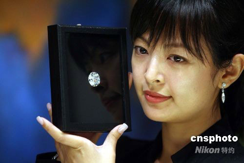 十月八日,香港佳士得向傳媒展示一批將于十二月二日拍賣的瑰麗珠寶首飾,圖中的四十四點(diǎn)四六克拉完美無暇巨鉆,估價超過六千萬港元。中新社發(fā) 洪少葵 攝