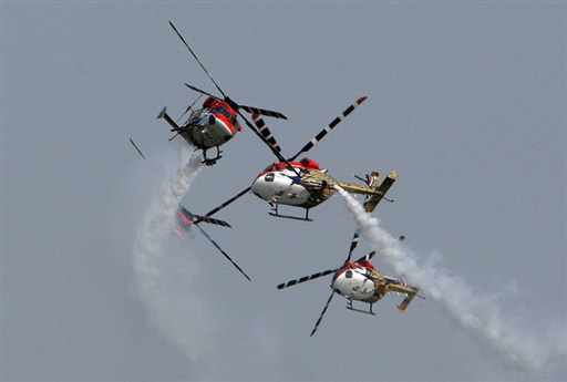 印度空軍為慶祝建軍76周年舉行印度航空展。圖為10月8日,印度空軍“孔雀”(Sarang)直升機特技飛行隊在欣登(Hindon)空軍基地進行表演。