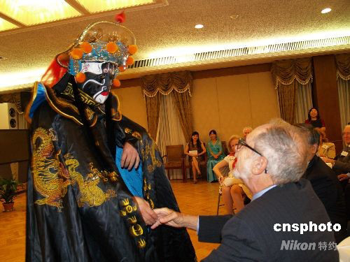 當(dāng)?shù)貢r(shí)間10月8日,中國(guó)駐洛杉磯總領(lǐng)館舉行“紀(jì)念中美建交30周年茶話會(huì)”,洛杉磯世界事務(wù)委員會(huì)的美國(guó)朋友約一百多人參加了茶話會(huì),共同暢談中美建交30年來(lái)的友誼。旅美京劇演員劉小任表演“變臉”,贏得滿堂喝彩。 中新社發(fā) 盧威 攝