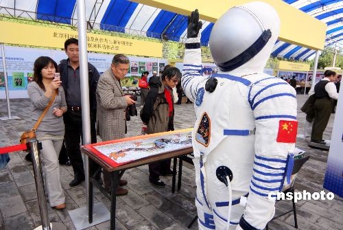10月10日,“神七”模型和中國(guó)造“飛天”太空艙外航天服吸引眾多市民參觀拍照。當(dāng)日,“太空禮贊·中國(guó)‘神舟’載人航天展覽”亮相北京地壇圖書節(jié)。據(jù)悉,按照1:5比例制作的‘神舟七號(hào)’飛船模型可謂是本次展覽的一大亮點(diǎn),這也是該模型首次在公眾面前展示,同類模型目前只在北京航天飛行控制中心內(nèi)有一個(gè)。中新社發(fā) 吳芒子 攝