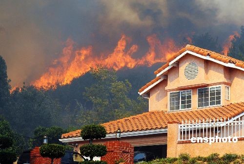 當(dāng)?shù)貢r間十月十四日中午,消防直升機在洛杉磯附近的山火現(xiàn)場實施空中滅火,大批消防員在地面阻止火勢蔓延。從周一開始,洛杉磯市西北約三十多公里的山區(qū)接連發(fā)生多起山火,由于當(dāng)?shù)毓纹鸫箫L(fēng),火勢迅速蔓延,難以控制。截至周二下午,過火面積已超過一萬四千英畝,山火已造成兩人死亡、四十九棟建筑物被焚毀,上千居民被迫緊急撤離。加州州長施瓦辛格周一已宣布洛杉磯和溫圖拉縣進入緊急狀態(tài)。中新社發(fā) 張煒 攝