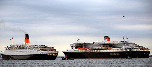 10月16日,巨型郵輪“伊麗莎白女王二號(hào)”(左)與“瑪麗女王二號(hào)”在美國(guó)紐約港相會(huì)。當(dāng)天,這兩艘豪華郵輪在紐約港會(huì)合,隨后一起駛回倫敦。已運(yùn)營(yíng)逾40年的豪華郵輪“伊麗莎白女王二號(hào)”將在這次航行之后退役,然后被改造成一座水上五星級(jí)酒店,停靠在阿聯(lián)酋迪拜的朱邁拉棕櫚島旁。