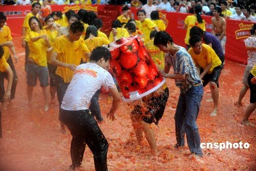 10月19日,一場(chǎng)番茄大戰(zhàn)在廣東省東莞華南MALL狂熱上演。為避免砸傷事故,15噸西紅柿經(jīng)過專門的軟化。此次狂歡活動(dòng)吸引了上萬人觀看。游客分批進(jìn)入番茄池狂砸,根本不管比賽規(guī)則,不要分?jǐn)?shù),只要開心。中新社發(fā) 許康平 攝