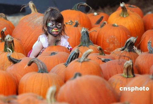 十月十九日,一位裝扮成鬼怪的美國女孩在南瓜地里嬉戲!叭f圣節(jié)”將至,許多洛杉磯市民來到遠(yuǎn)近聞名的貝弗利山莊“骨頭先生南瓜田”,選購自己中意的南瓜,準(zhǔn)備自制南瓜燈,為即將到來的萬圣節(jié)營造節(jié)日氣氛。中新社發(fā) 張煒 攝
