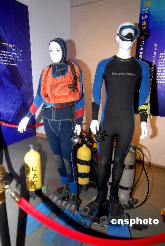 2008年10月20日,《南海驚夢——“南海一號”》在杭州南宋官窯博物館臨時展廳正式展出。圖為打撈“南海一號”時考古人員使用過的潛水裝備。 中新社發(fā) 引煒 攝