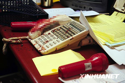 韓國(guó)首都首爾發(fā)生縱火行兇事件的旅館,管理辦公室內(nèi)的電話上沾滿了被害人的鮮血。新華社/紐西斯通訊社