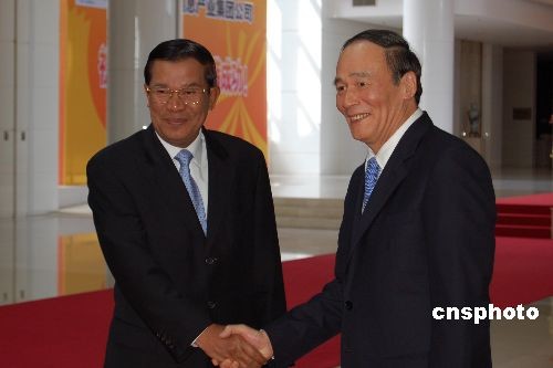 中國(guó)國(guó)務(wù)院副總理王岐山在廣西南寧會(huì)見(jiàn)了柬埔寨首相洪森一行。