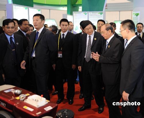 出席第五屆中國—東盟博覽會的緬甸總理登盛(右二),十月二十一日巡視了展館。他對中國和緬甸的農(nóng)業(yè)合作表現(xiàn)出濃厚的興趣。中新社發(fā) 蔣雪林 攝