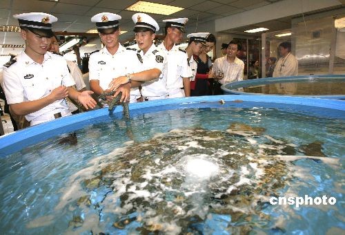 圖為官兵們在科大海岸海洋實(shí)驗(yàn)室參觀。