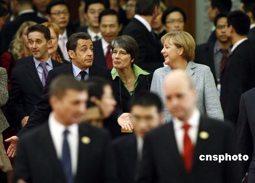 法國(guó)總統(tǒng)薩科奇與德國(guó)總理默克爾出席會(huì)議。中新社發(fā) 盛佳鵬 攝
