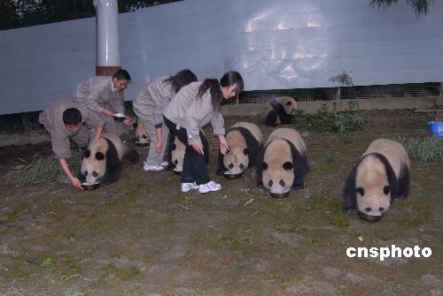 截至10月下旬,雅安碧峰峽基地生活著60余只大熊貓。圖為飼養(yǎng)員們給07年出生的熊貓幼仔喂食。
