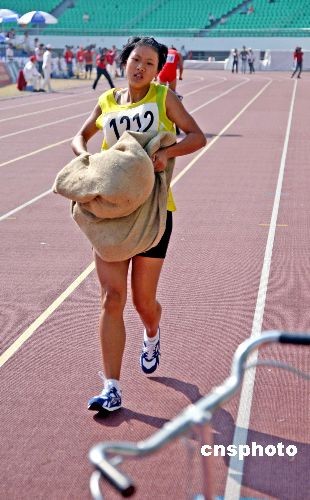 圖為女子60米搶收糧食進(jìn)倉(cāng)比賽時(shí)選手拿空袋起跑。