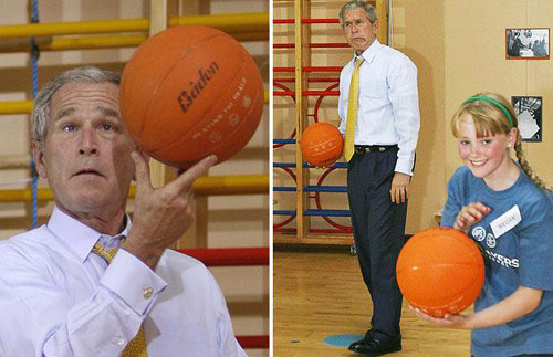 2008年6月16日,布什在北愛爾蘭的貝爾法斯特與初中生一起玩籃球。作者:旺仔