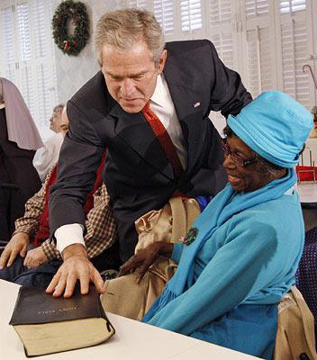 布什在參觀華盛頓的老年人慈善機(jī)構(gòu)“窮人姐妹”時(shí),好奇地看一位老年人的《圣經(jīng)》。作者:旺仔