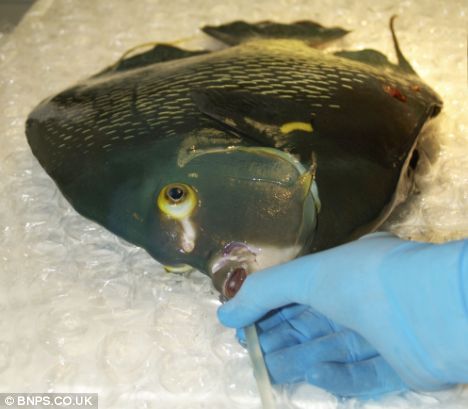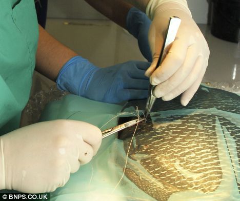 桑頓首先給這條患病的天使魚進(jìn)行注射麻醉,還在它的嘴部插入一根塑料導(dǎo)管,用水泵將其體內(nèi)的水排出體外,接著他修復(fù)其內(nèi)臟,并用鑷子和針線將傷口處縫合。被放入水中后,這條天使魚開始慢慢蘇醒,不過(guò)獸醫(yī)表示在它完全恢復(fù)健康之前仍需要仔細(xì)觀察。