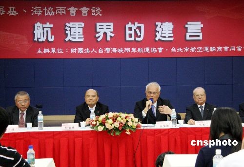 10月30日下午,臺灣?蘸竭\業(yè)界代表由臺灣海峽兩岸航運協(xié)會常務(wù)顧問、長榮集團首席副總裁林省三牽頭,與臺灣領(lǐng)導(dǎo)人馬英九見面并遞交陳情書,希望即將在臺北登場的陳云林與海基會董事長江丙坤會談能排除萬難,實現(xiàn)海空直航,促進兩岸經(jīng)貿(mào)發(fā)展,造福于民。隨后,他們在臺北舉行記者會,表示非常歡迎海協(xié)會會長陳云林訪臺,并期盼兩岸直航早日落實。中新社發(fā) 黃少華 攝
