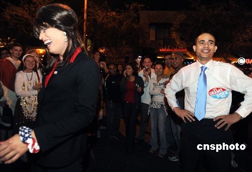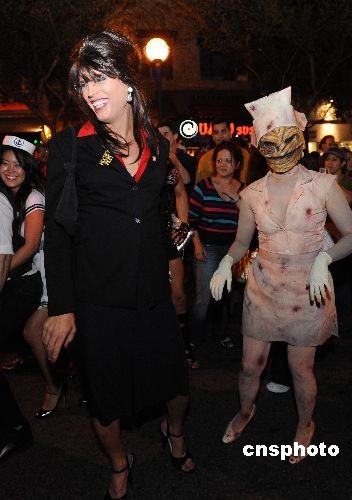 當(dāng)?shù)貢r(shí)間10月31日,萬(wàn)圣節(jié)之夜,一位民主黨的支持者男扮女裝成佩林形象,在街頭巧遇民主黨總統(tǒng)候選人“奧巴馬”!皧W巴馬”始終以正面形象示人,而“佩林”慘遭惡搞。當(dāng)晚,數(shù)十萬(wàn)洛杉磯市民走上街頭參加萬(wàn)圣節(jié)之夜大游行,西好萊塢的圣塔莫妮卡大道上“群魔亂舞”,面目猙獰的“妖魔鬼怪”帶來(lái)的不是恐怖而是快樂(lè)。中新社發(fā) 張煒 攝
