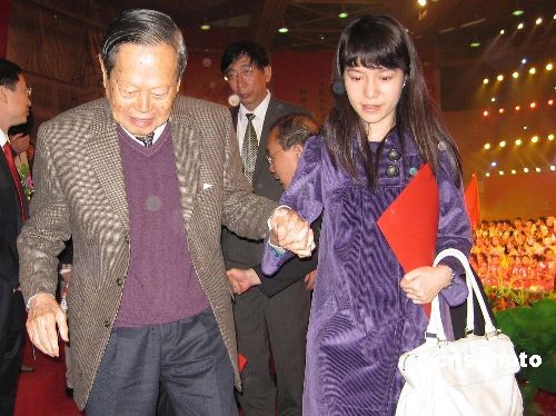 11月1日,在西南聯(lián)大在昆建校70周年在會(huì)上,楊振寧夫婦甫一出現(xiàn),立刻成為媒體關(guān)注的焦點(diǎn)。面對(duì)頻閃不斷的鎂光燈,楊振寧夫婦面帶微笑,極為配合。大會(huì)結(jié)束后,在翁帆的攙扶下,楊振寧走下主席臺(tái)。中新社發(fā) 劉子倩 攝